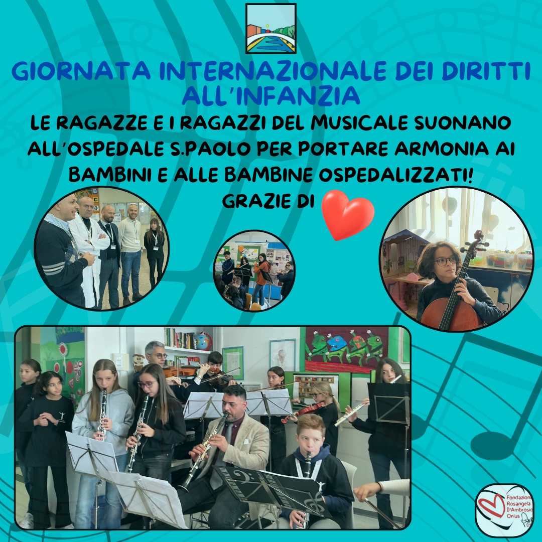 Grazie ai ragazzi, alle ragazze del musicale e ai loro mitici Prof. che nell’ambito del Volontariato e della Solidarietà, il 25 novembre, durante la Giornata Internazionale per i Diritti all’Infanzia, si sono recati all’Ospedale S.Paolo per portare musica e armonia ai bambini e alle bambine ospedalizzati! Un’orchestra speciale che ha suonato per i piccoli pazienti affinché il diritto ad ascoltare buona musica non sia un privilegio per pochi. Grazie di cuore.